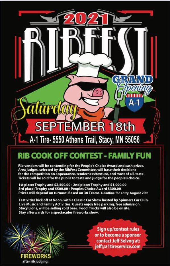 Calendar Add to Calendar Add to Timely Calendar Add to Google Add to Outlook Add to Apple Calendar Add to other calendar Export to XML When: September 18, 2021 all-day 2021-09-18T00:00:00-05:00 2021-09-19T00:00:00-05:00 Rib Fest – Location A1 Tire