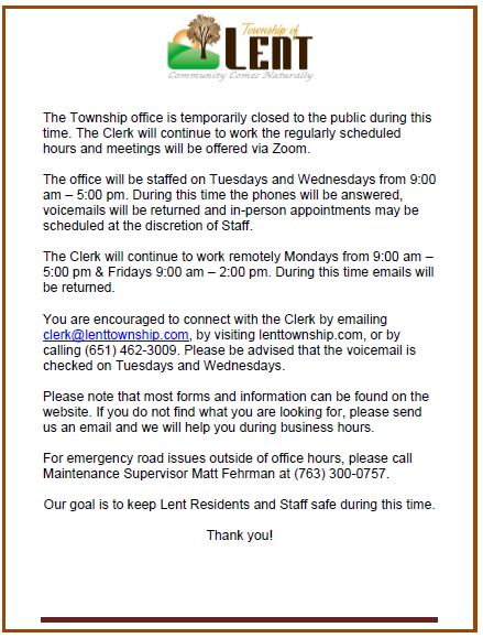The office is open by appointment only. Please call or email clerk@lenttownship.com to set up a time to meet with Kelly. We may find that your project can be done via email.