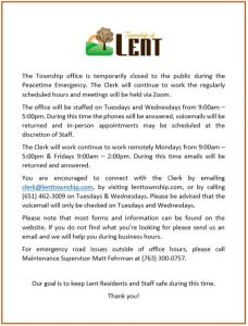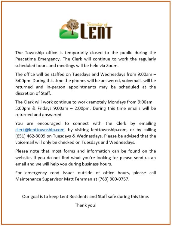 The office is open by appointment only. Please call or email clerk@lenttownship.com to set up a time to meet with Kelly. We may find that your project can be done via email.