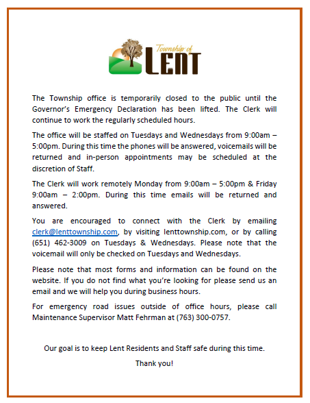 The office is open by appointment only. Please call or email clerk@lenttownship.com to set up a time to meet with Kelly. We may find that your project can be done via email.
